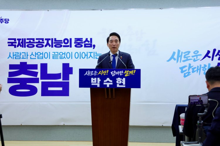 더불어민주당 충남도지사 결선 후보인 박수현 국회의원(공주·부여·청양)이 9일 충남도청에서 기자회견을 열고 ‘UN AI 허브 충남 유치’와 ‘교통이 통(通)하는 충남’ 구상을 핵심으로 한 공약을 발표했다. 박 후보는 충남이 전력 인프라와 행정 기반, 교통 접근성을 두루 갖춘 지역이라는 점을 앞세워 국제 공공지능 중심지와 초광역 교통 허브로 도약시키겠다는 청사진을 제시했다.