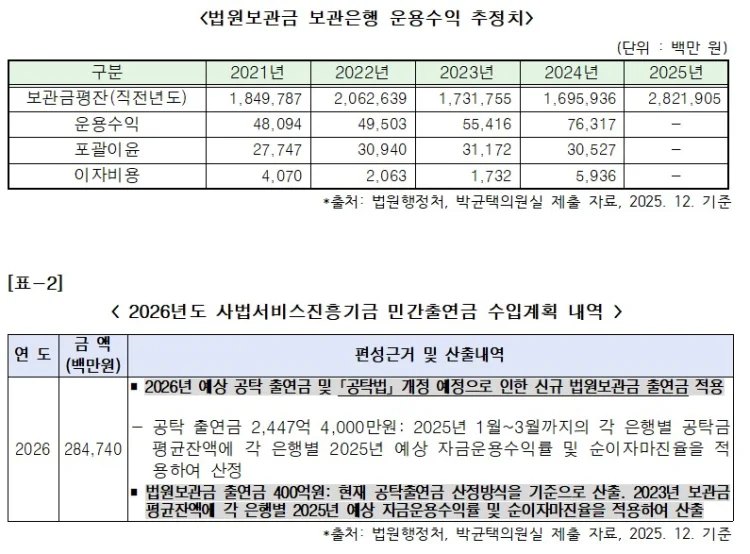 비교 대상도 있다. 공탁금은 법적 근거에 따라 운용수익을 사법서비스진흥기금으로 출연받아 소년보호 지원, 민원서비스 개선, 사법서비스 향상 등 공적 목적에 쓰고 있다. 반면 법원보관금은 유사한 성격의 자금임에도 환원 장치가 없어 ‘동일한 돈, 다른 귀속’이라는 불합리가 지속됐다는 지적이 이어져 왔다.