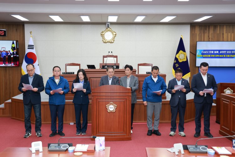 군의회는 성명서를 통해 “주민들은 소음, 조망권 침해, 토지 가치 하락, 농작업 불편은 물론 심리적 스트레스까지 고스란히 감당하고 있다”며, “그럼에도 불구하고 한국전력공사의 보상은 여전히 최소한의 법적 기준에만 머물러 있다”고 강하게 비판했다.
