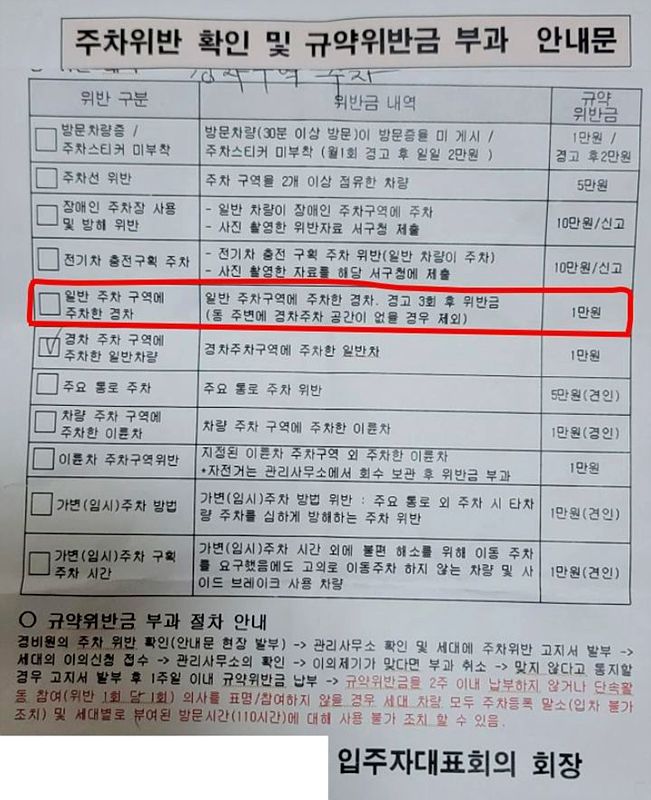 안내문에는 주차 위반 유형별로 위반금이 책정돼 있었다. 방문 차량증이나 주차 스티커를 부착하지 않을 경우 최초 1만원, 이후 2만원의 위반금이 부과된다. 주차 구획을 두 칸 이상 점유하면 5만원, 장애인 주차구역 위반이나 전기차 충전구역 주차 시에는 각각 10만원의 위반금이 부과된다.