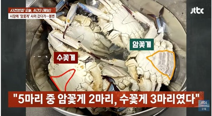 피해 소비자가 암꽃게를 구매하려 했으나 실제로는 암꽃게와 수꽃게가 섞여 있었다. (자료사진=JTBC News 사건반장 캡처)전통시장에서 암꽃게를 구매했다가 수꽃게를 섞어 파는 이른바 '바구니 바꿔치기'식 피해를 입은 소비자가 상인으로부터 인신공격성 폭언까지 듣는 사건이 발생해 논란이 일고 있다.