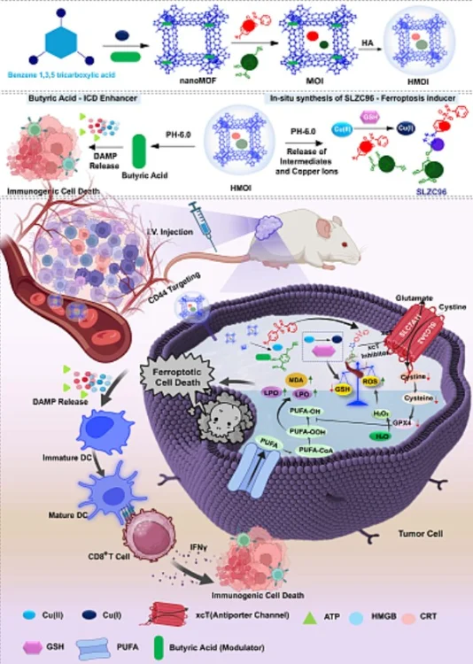 이번 연구의 핵심인 HMOI 나노플랫폼은 표면의 히알루론산(HA) 코팅을 통해 대장암 세포를 정밀하게 표적한다. 암세포 내부에 들어가면 플랫폼 구조의 구리 이온(Cu²⁺)이 환원되며 촉매 반응을 유도하고, 비활성 전구체들을 강력한 페로토시스 유도제 SLZC96으로 즉각 조립한다.