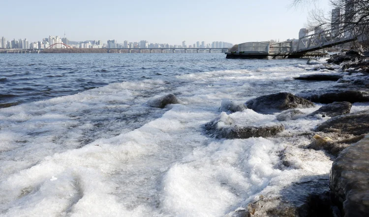 서울 최저기온이 -12도를 기록하며 한파특보가 발효된 지난 2일 서울 영등포구 여의도 한강변에 얼음이 얼어있다.