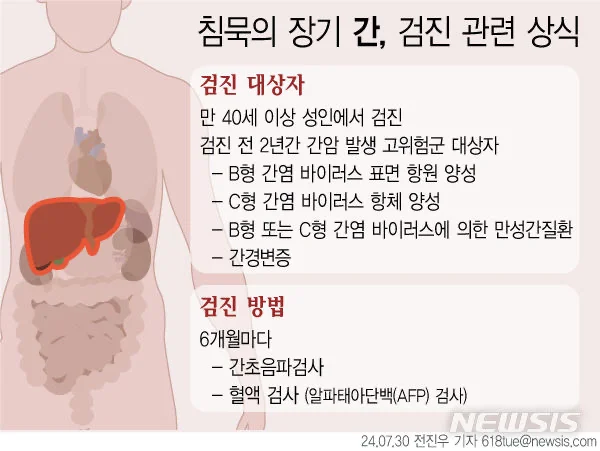 증상 없어 더 위험한 간암, 정기검진 필수간은 통증이 거의 없어 간암 초기에는 특별한 이상을 느끼기 어렵다. 이 때문에 간암은 '조용히 진행되는 암'이라 불리기도 한다. 증상이 나타날 때에는 이미 병이 상당히 진행된 경우가 많다.